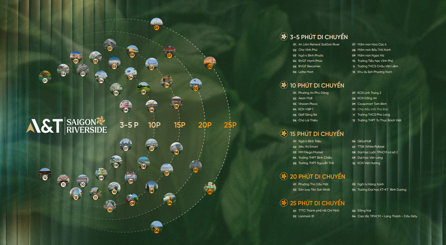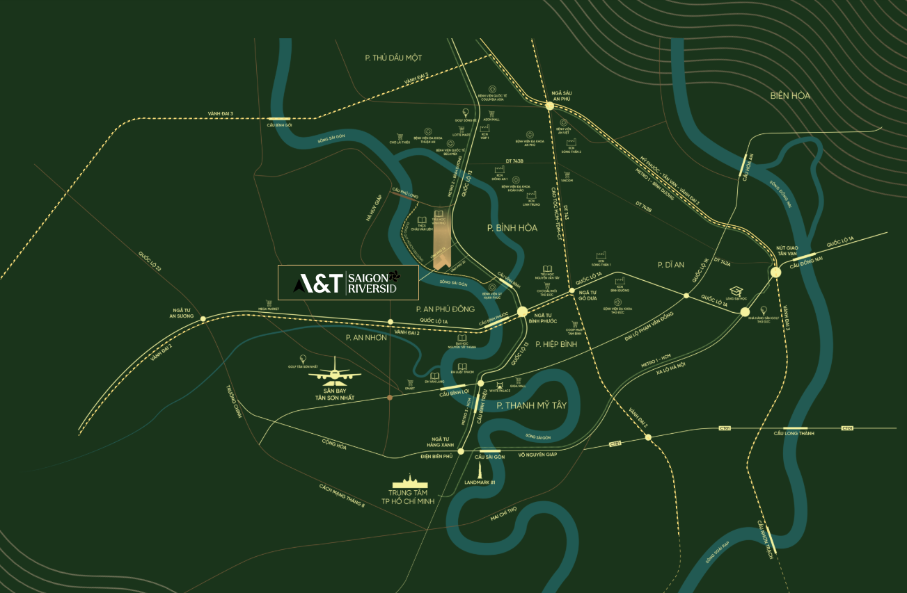 Sở hữu vị trí vàng tại khu Đông Bắc TP.HCM, A&T Saigon Riverside thừa hưởng nhịp sống hiện đại với chuỗi tiện ích ngoại khu đẳng cấp đáp ứng trọn vẹn mọi nhu cầu của cư dân: